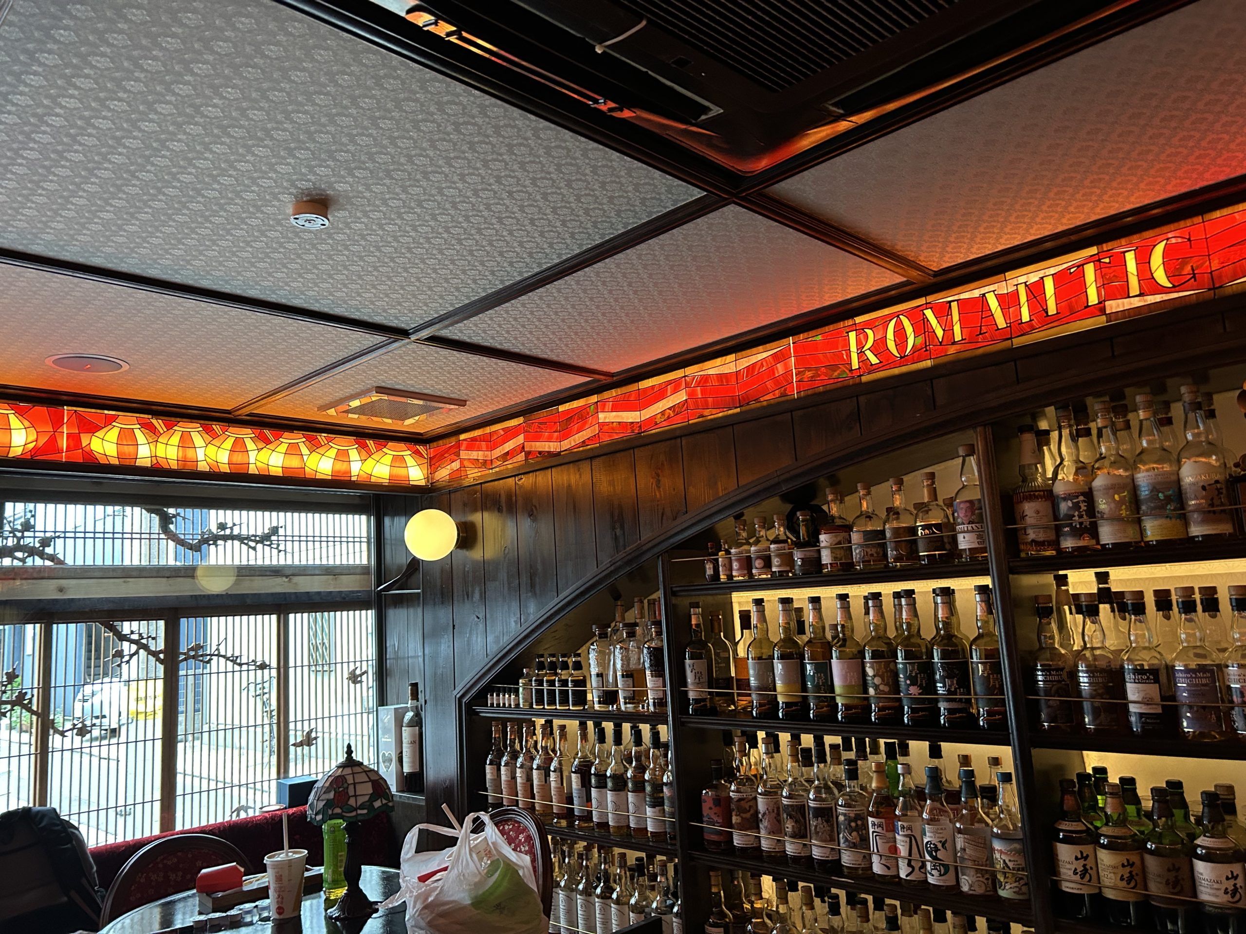 今回のグラスアート作品は、外の看板と店内壁面を彩る大きな仕事だった。依頼主からは「店の顔になるような華やかさを」との要望があり、私は光の加減や色の組み合わせを何度も試行錯誤した。完成した看板は、ステンドグラスのように華やかで、昼と夜で異なる表情を見せる。室内の壁面には、赤を基調としたデザインを施し、棚に並ぶウイスキーのボトルと調和するよう工夫した。作品が店の雰囲気を一層引き立てている様子を目にしたとき、長年培ってきた技術が形となった喜びを深く味わった。